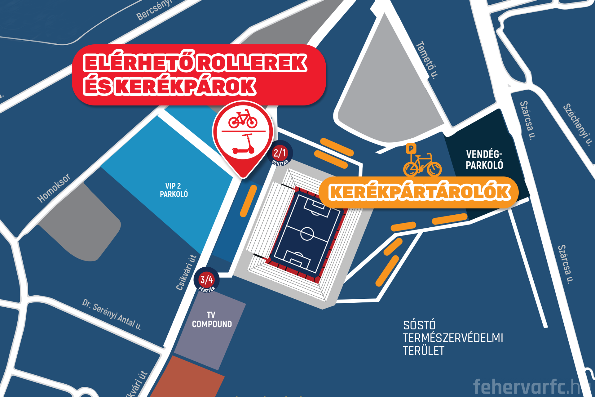 Gyertek minél többen biciklivel Sóstóra, így csökkentve a károsanyag-kibocsátást! A stadion körül összesen 262 biciklitároló van, amelyeket a mellékelt térképen láthattok. (Klubunk őrzött biciklitárolót nem tud biztosítani.)